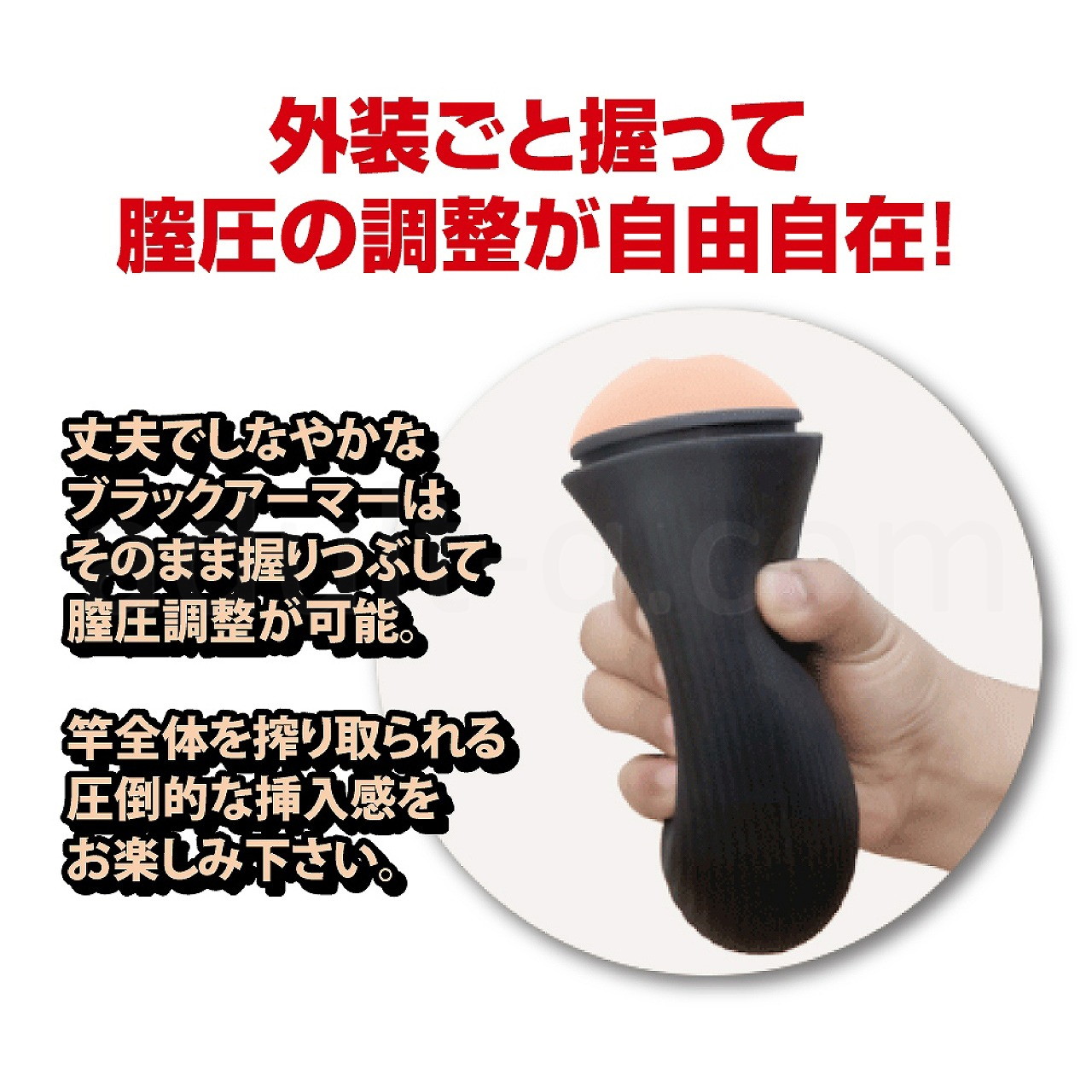 ブラックアーマーにより全体が圧迫され、通常の二層構造とは異なる最高の締めつけ感を実現したオナホールです。