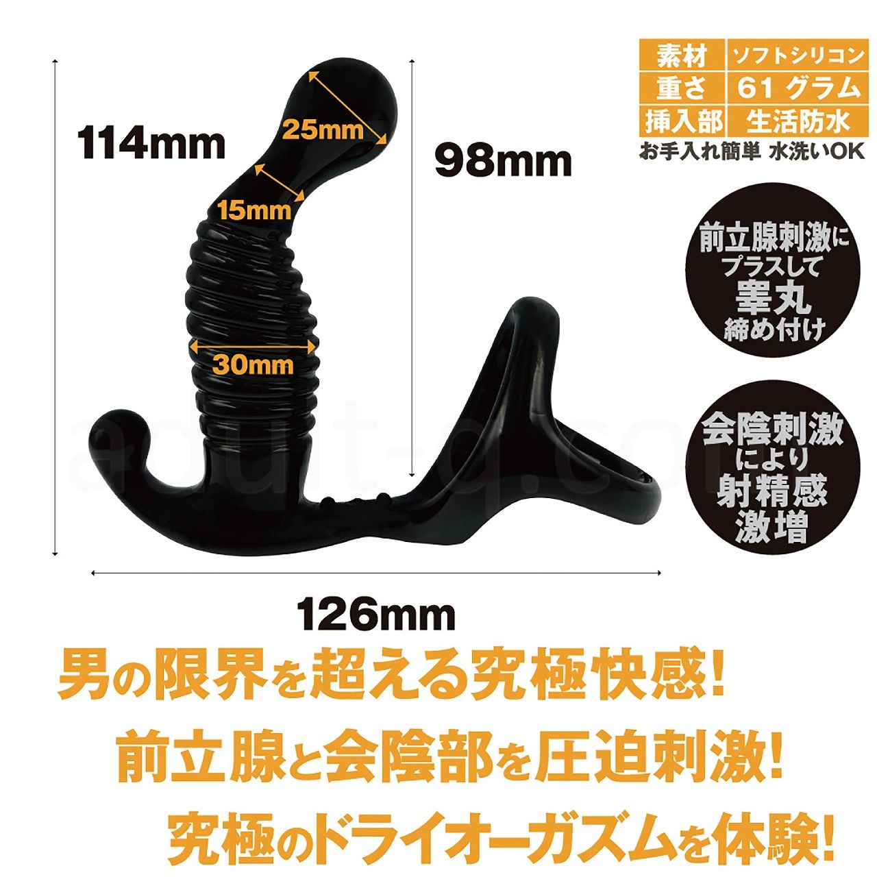 前立腺への刺激と、ペニス・睾丸の締め付けを両立 させた、コックリング一体型エネマディルドです。