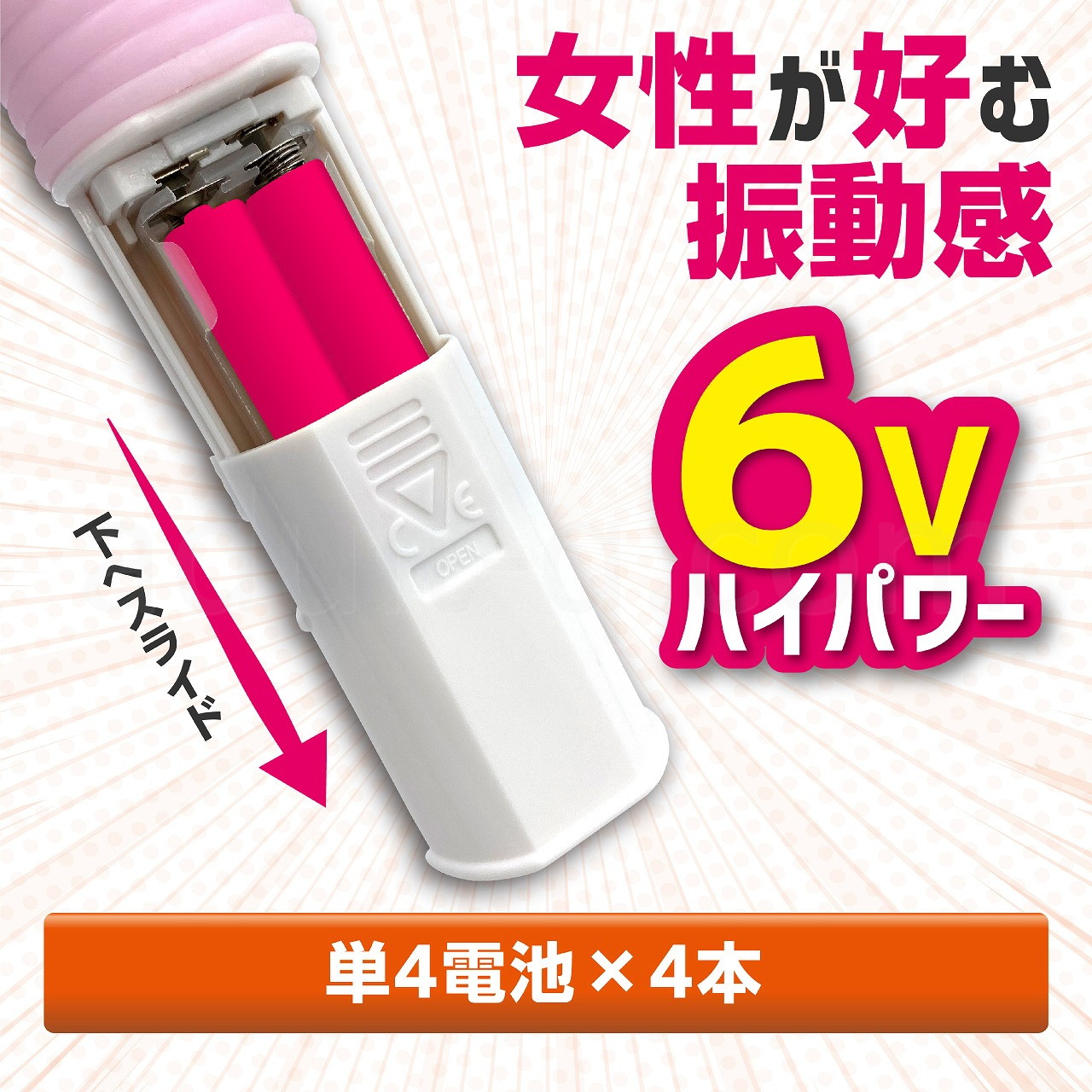 乾電池を4本も使用するので、ハイパワーで強力振動+スイング回転を実現。