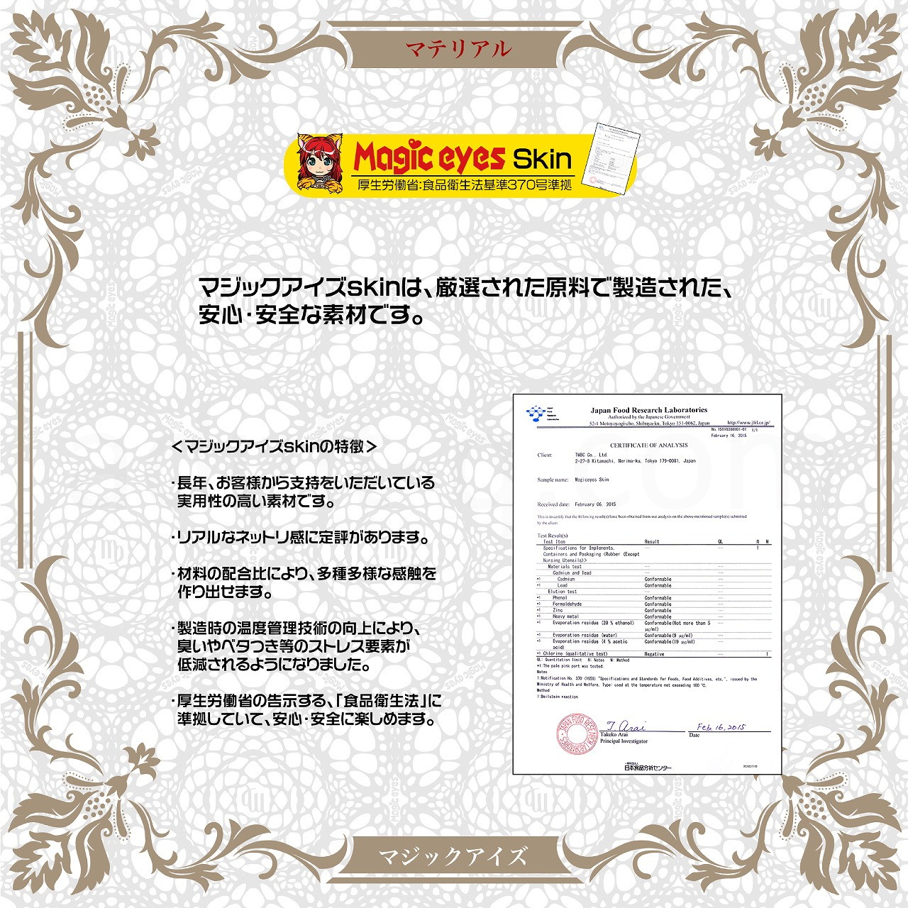 使用素材は、厚生労働省告示:食品衛生法基準 第370号準拠したMagiceyesスキンを採用しているので安心です。